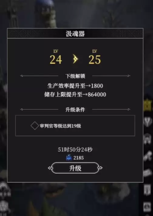 升级后的汲魂器每小时能产出60个单位魂力,更高级别会提升产量。但要注意存储上限会随着角色等级变化:10级时可储存1000个,25级提升至2500个。有趣的是,这一上限在后期将保持恒定,即使角色升到50级也不会再增加。