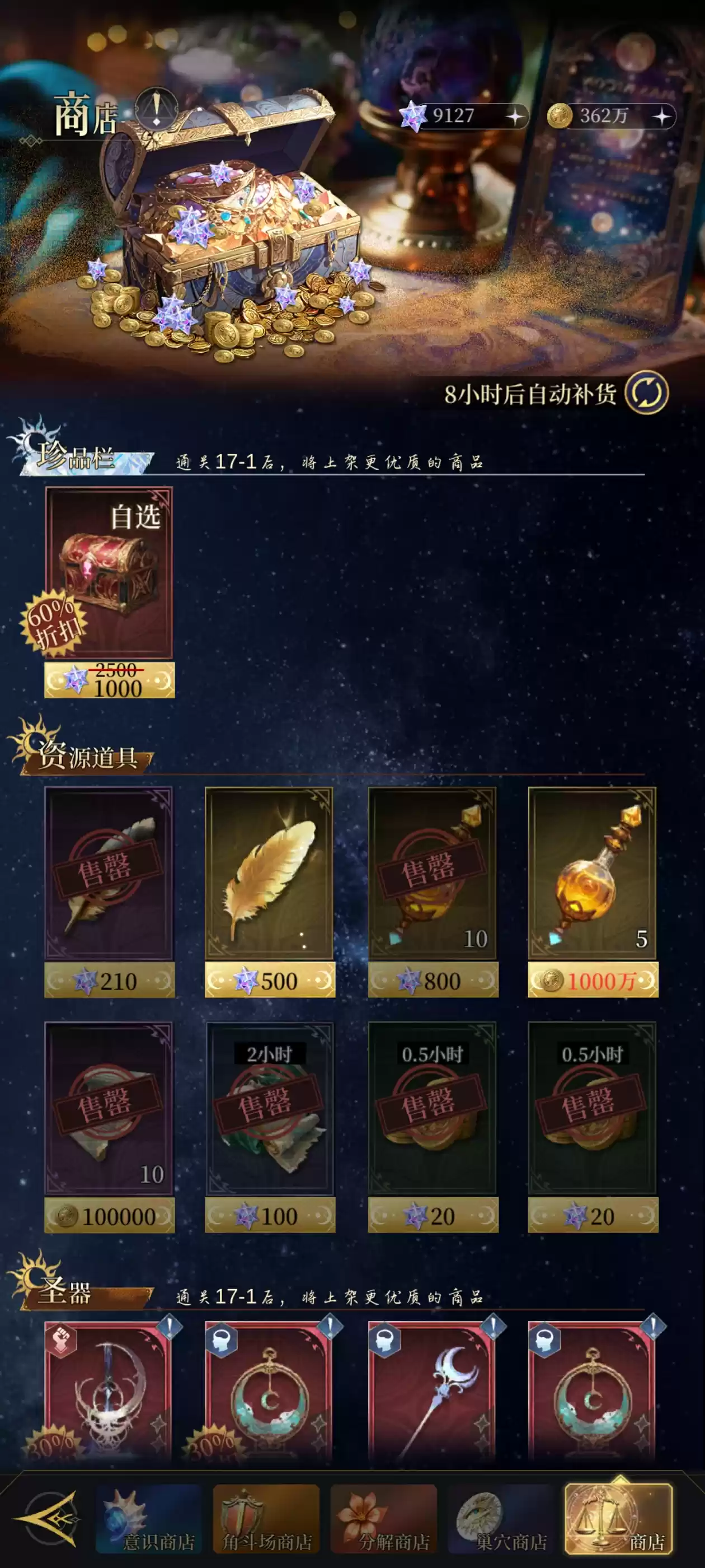 珍品区商品除1000钻石的红装自选箱(仅限冲击榜单的重氪玩家)外都建议购入。资源道具区初始两排商品中,第一排包含30%折扣的普通抽卡、原价阵营抽卡、8折金色碎片等,随着关卡推进会解锁新的商品。其中30%折扣的普抽必买,第二排的资源箱全部购入,其他商品不建议购买。每日建议刷新至500钻石即停,追求进度的大佬可以继续刷新。红黄升级材料出现后,可根据需求适当购买。