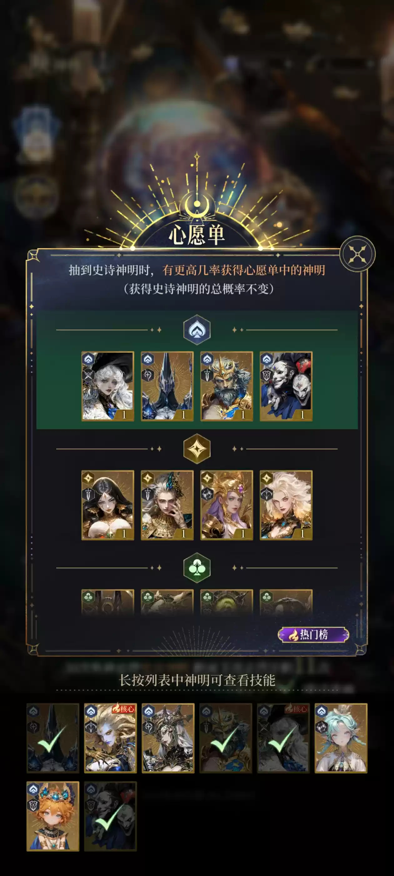 黑桃阵营:赫卡忒(后期主力输出)、波塞冬(神器10级后质变)、摩墨斯(强力坦克)、涅墨西斯(竞技场专用)