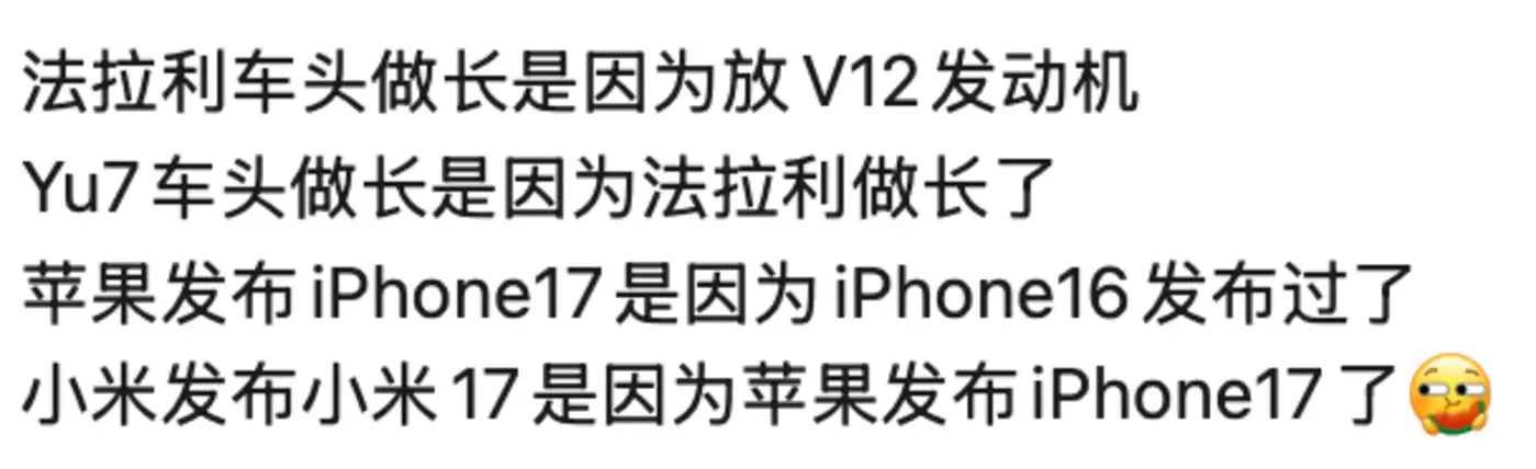 在这个框架中,用户会自然地将它与市面上的 17(当然是iPhone17)进行联想,从而觉得小米和苹果是同一档次的竞争者。