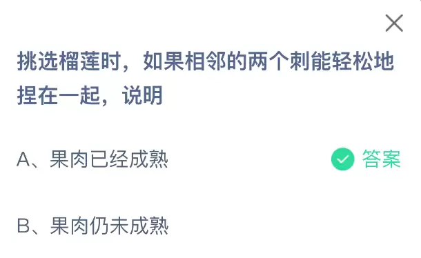 挑选榴莲时,如果相邻的两个刺能轻松地捏在一起,说明?支付宝小鸡课堂开课啦!每天花一分钟答题赚饲料,喂喂小鸡就能贡献爱心啦!轻松又意义十足!2025年9月18日蚂蚁庄园的小鸡课堂题目正确答案是【果肉已经成熟】,如果相邻的两个刺能轻松地捏在一起,说明这个榴莲的果肉已经成熟、变得软糯了。榴莲成熟后,果肉会释放乙烯气体催熟外壳,导致刺与刺之间的连接处变软。此时尖刺可轻松捏合,表明果肉已发育成熟且口感最佳。