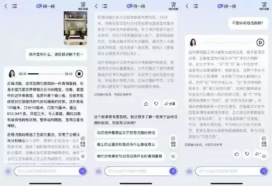 在使用过程中,AI不仅能提供基础知识的精准解读,更擅长挖掘文物背后的精彩故事。以著名的后母戊鼎为例,AI会先系统介绍其铸造年代、工艺特点和纹饰含义,继而讲述抗战时期河南村民保护国宝的感人事迹。讲解结束后,AI还会主动引导用户深入了解相关话题,比如青铜器的传说故事或饕餮纹饰的祭祀内涵。