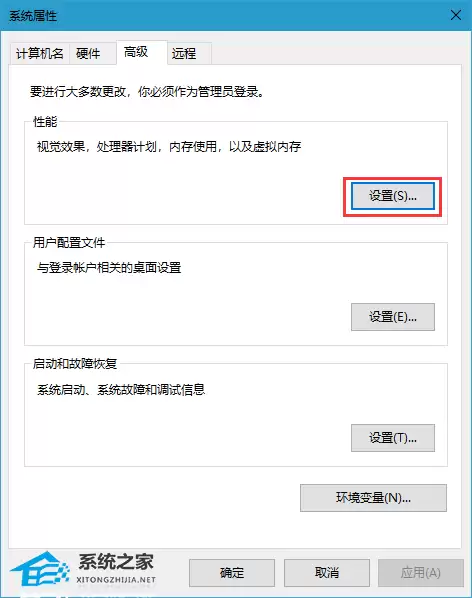 2. 开始在打开的属性窗口中将鼠标切换至“高级”,随后选择“性能”下的“设置”进入。