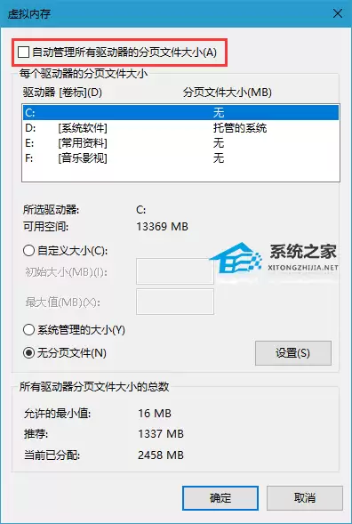 4. 开始在打开的虚拟内存界面中取消勾选“自动管理所有驱动器的分页文件大小”。