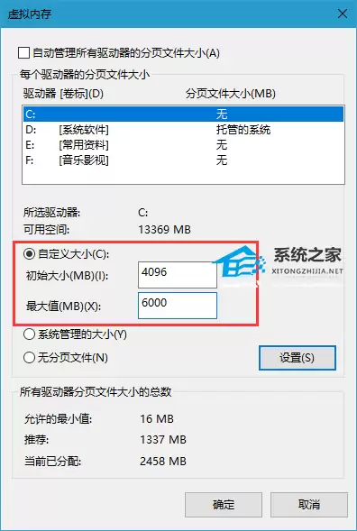 5. 直接选择自定义大小,最小值为内存大小两倍,最大值自定。随后重启电脑使设置生效。