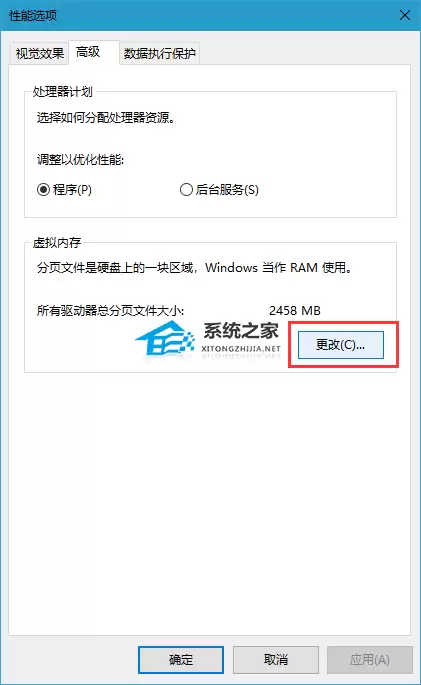 3. 继续将鼠标切换至“高级”选项,点击“虚拟内存”下的“更改”进入。