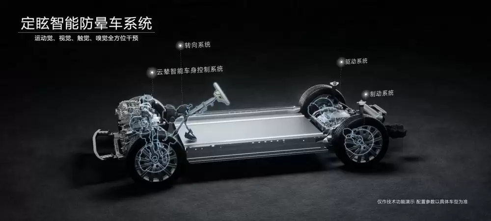 腾势N9搭载定眩智能防晕车系统,并已通过“中汽中心”、“中国人民解放军空军特色医学中心”的严苛认证,该系统以云辇智能车身控制系统为核心,通过联动底盘、动力、座舱三大系统,实现对运动觉、视觉、嗅觉、触觉等全方位干预,让用户告别晕车!