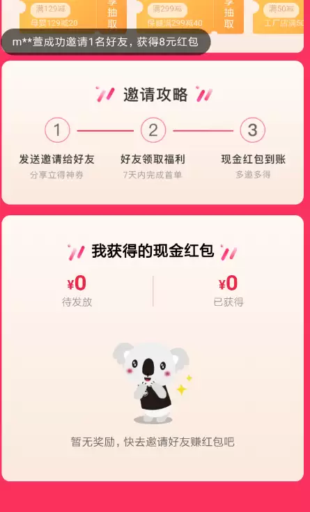 3、成功邀请的标准:好友在收到邀请后的7天内完成首单实付金额超过8元的购物,系统将自动发放红包奖励到您的账户。