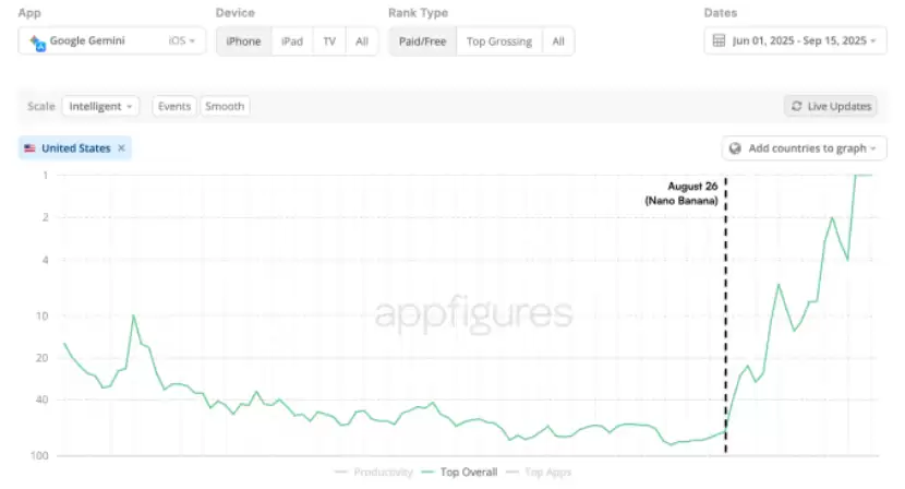 Nano Banana在8月26日“匿名”发布,后来证明这款模型就是谷歌的Gemini 2.5 Flash Image模型。Nano Banana的成功也使得谷歌的Gemini APP的下载量飙升。