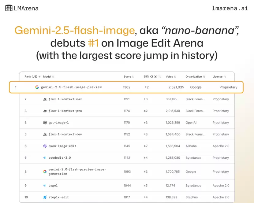 上线后Nano Banana的Elo分数明显领先(来源:LM Arena )