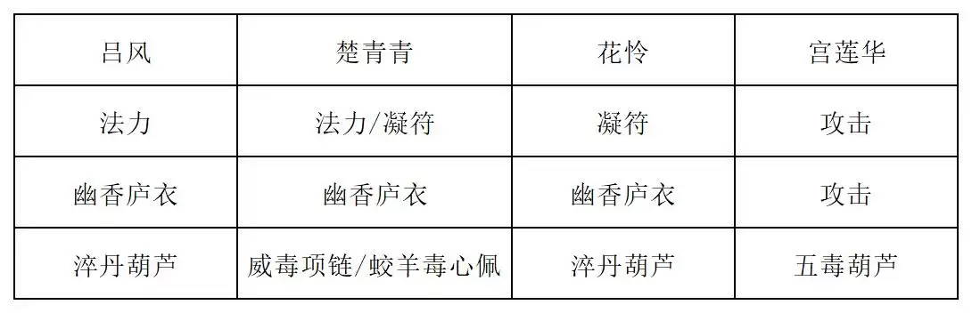 在《长生:天机降世》的魍魉树海幻境中,一套13级阶段的实用通关阵容为:吕风(携带法力装备)、楚青青(搭配法力装与聚灵镯)、鸠真真(选择血量装备)以及赵紫薇(同样配备血量装备)。该组