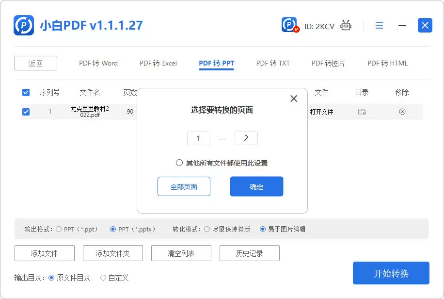 2、在软件界面上方选择输出格式为PPT,并设置转换的页面数量。