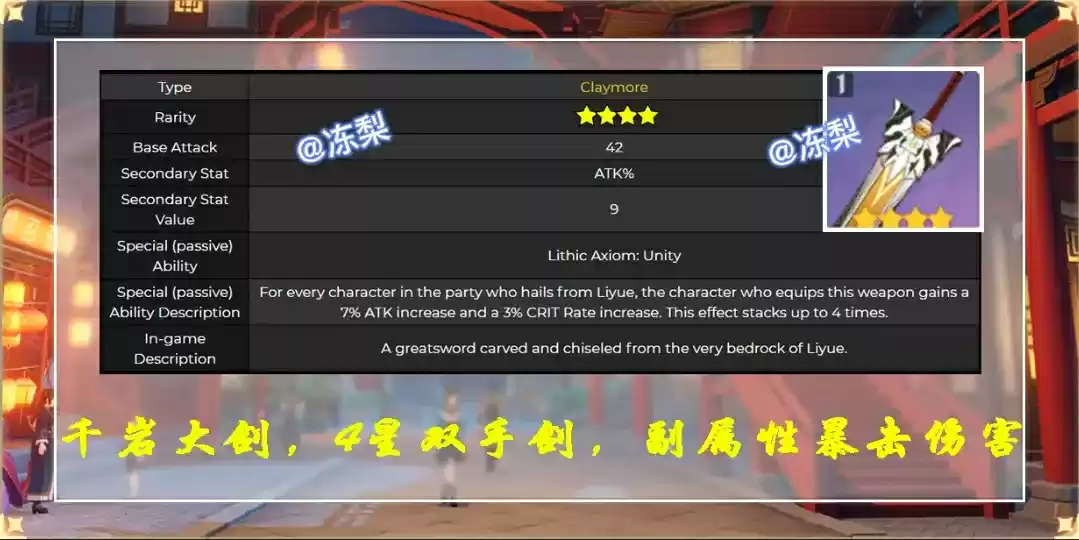 原神中的千岩大剑作为四星双手剑,其独特之处在于提供暴击伤害的副属性加成。该武器的被动技能"千岩绝同心"与千岩长枪效果一致,能够基于队伍中璃月角色的数量带来属性增益。这款武器特别适合依赖暴击输出的角色使用,能显著提升战斗表现。