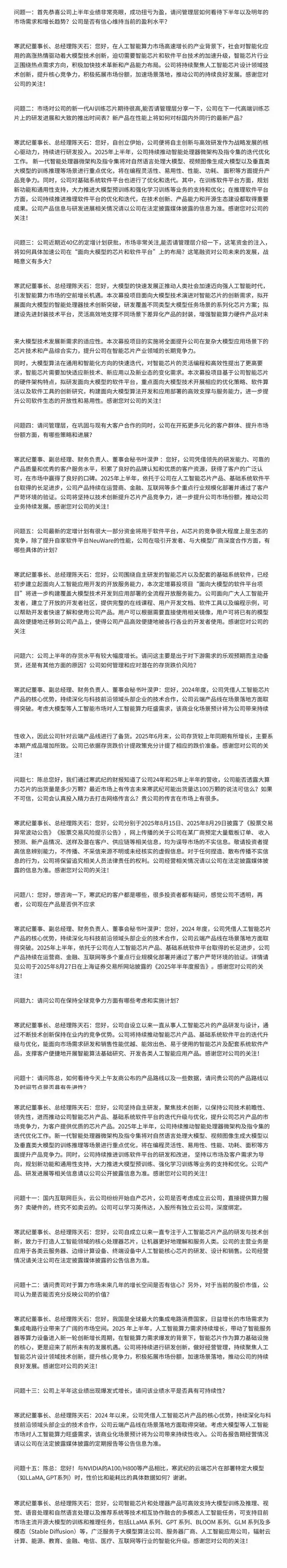 谈及未来研发方向,管理层透露下一代智能处理器将聚焦多模态大模型场景进行专项优化,预计将在计算密度、能源效率等核心指标上实现跨越式提升。同时强调所有技术进展将以正式公告为准,建议投资者保持理性预期。整场活动持续近120分钟,管理层共计回应投资者二十余个关键问题。