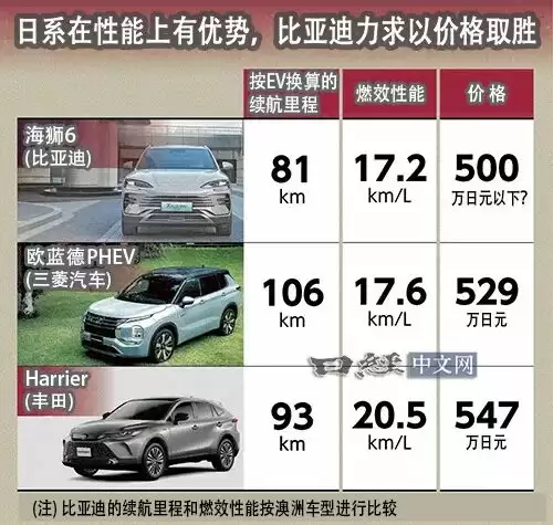 从日本市场上对比亚迪构成竞争的日本企业的PHV来看,丰田和三菱汽车占有很高的份额。与丰田的“Harrier(凌放)”和三菱汽车的“欧蓝德PHEV”相比,比亚迪的海狮6在续航里程和燃效性能方面略显逊色。不过,在价格方面,比亚迪的专卖店表示,日本厂商的PHV超过500万日元(约合24.13万元),而比亚迪则设定在500万日元以下,将主打高性价比。