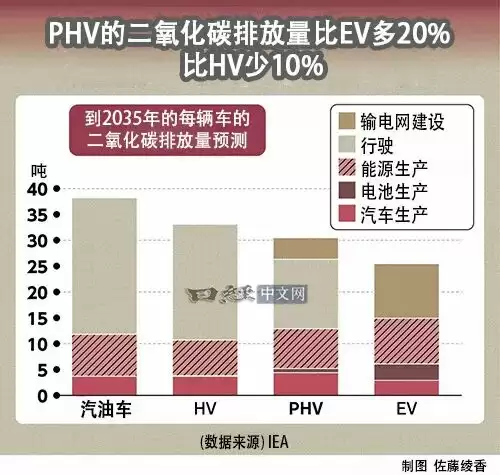 今后PHV普及的关键是对环保性能的评价。IEA估算了到2035年每辆汽车从车辆生产到输电网建设的二氧化碳排放量。结果显示,PHV比EV的排放量多2成,比HV少1成。与EV相比,虽然电池生产环节的环境负荷得到控制,但行驶时仍会排放二氧化碳。
