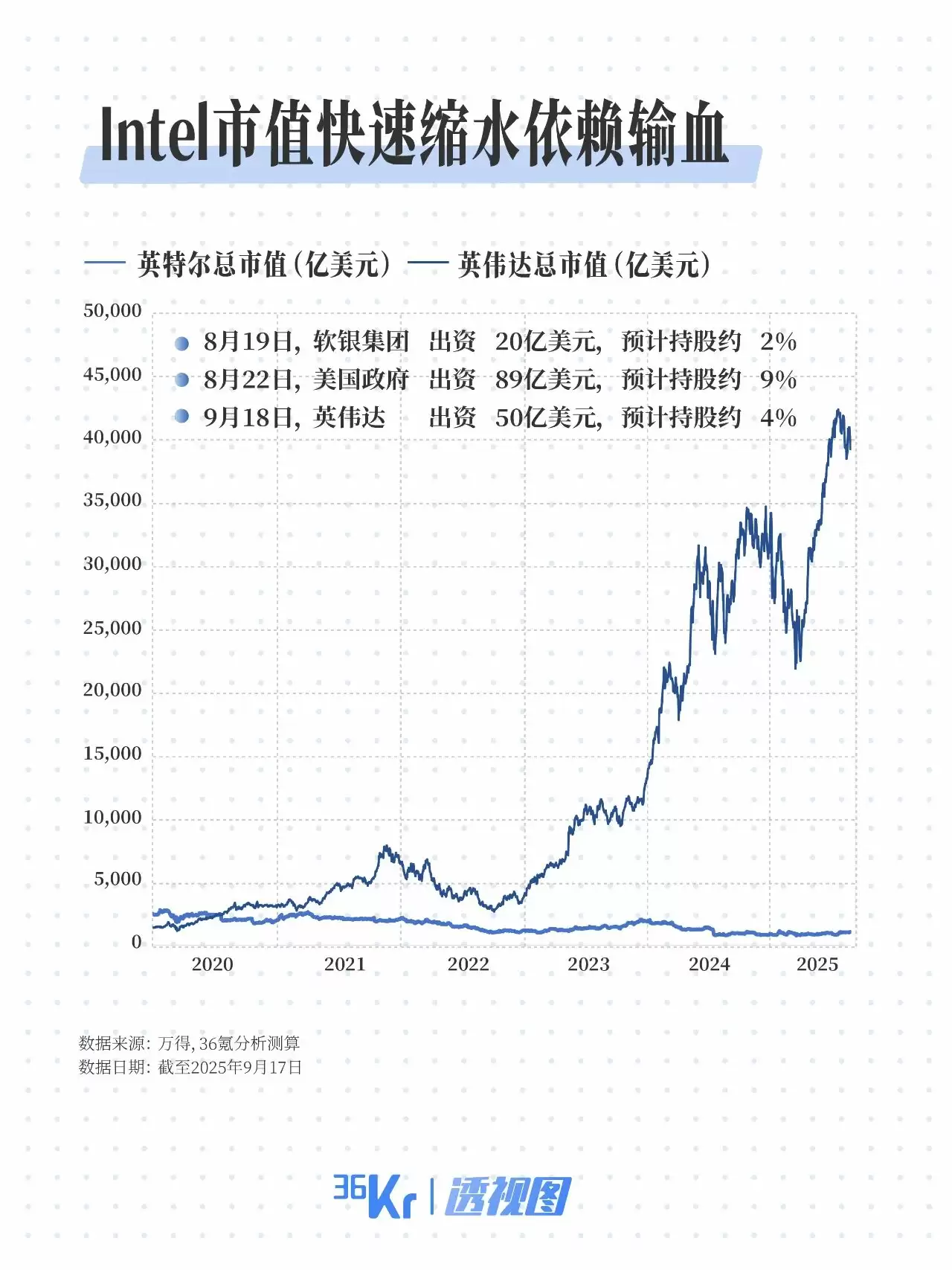 9月18日,英伟达宣布将以每股23.28美元的价格向英特尔普通股投资50亿美元,投资完成后,英伟达预计将持有英特尔4%以上股份。