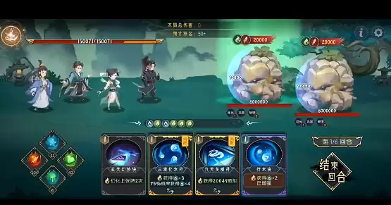 这个boss由于会给自己上盾,我们目前血量还扛不住,第一回合我们可以用阵法牌破另一个石精的盾,另外我们需要在中间回合给他破一次盾,方法可以用轮回断水打另一个没有破甲的石精,也可以丢一个剑雷丹破盾,不过我们没有毕方髓血印和战鼓炽晶臂来增加战意了,所以少吃一回合战意丹要亏不少伤害。
