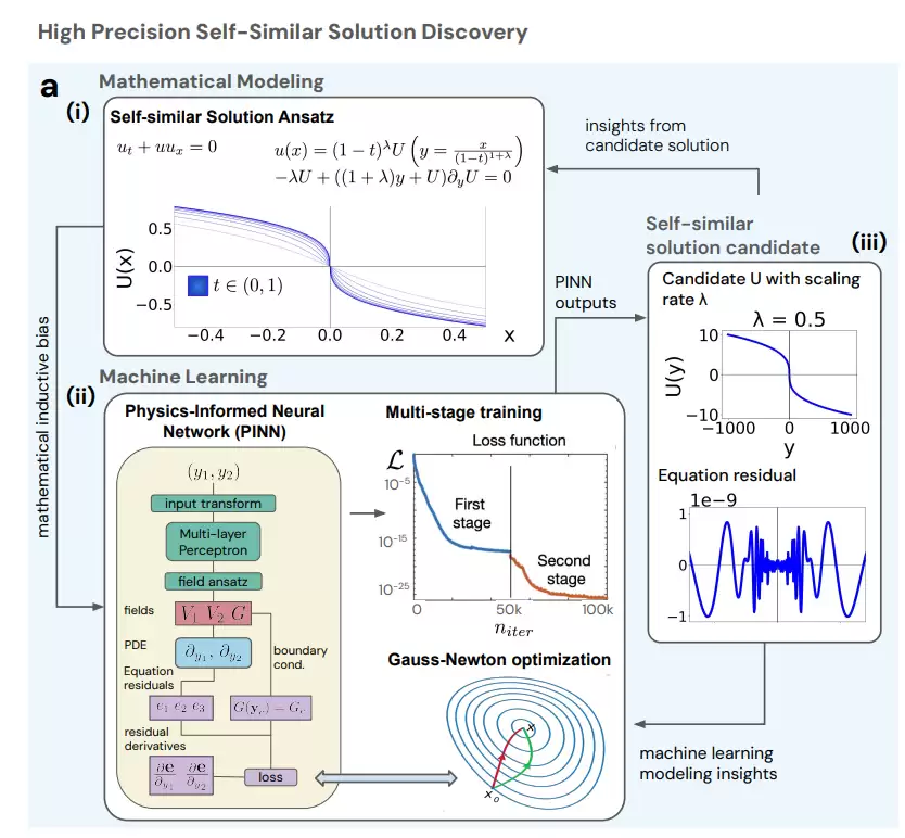 在这个过程中,研究人员采用物理信息神经网络(PINN),结合高斯-牛顿优化器(Gauss-Newton optimizer)与多阶段训练(Multi-stage training)策略,在寻找正确缩放率 λ 的同时生成高精度候选解。