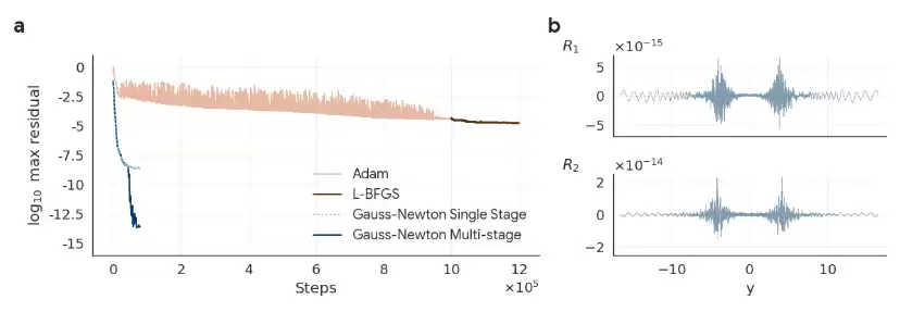 采用该优化器,其实是由于目前常见的标准梯度优化器(如 Adam 或 L-BFGS)不足以产生方程的高质量解,因此研究团队选择了更强的 Gauss–Newton 优化方法来优化神经网络,由于本次网络规模较小,这种原本不可行方案得以奏效。实验结果表明,Gauss–Newton 可以在大约 50,000 次迭代内将残差降到 10⁻⁸,对比标准梯度优化器表现出更佳的性能和显著更快的收敛速度。