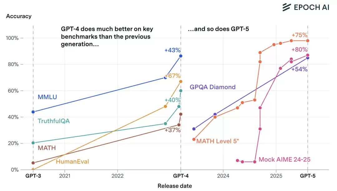 以GPT-5与GPT-4为例,它们均在基准测试中实现了相较于上一代代产品的重大飞跃。