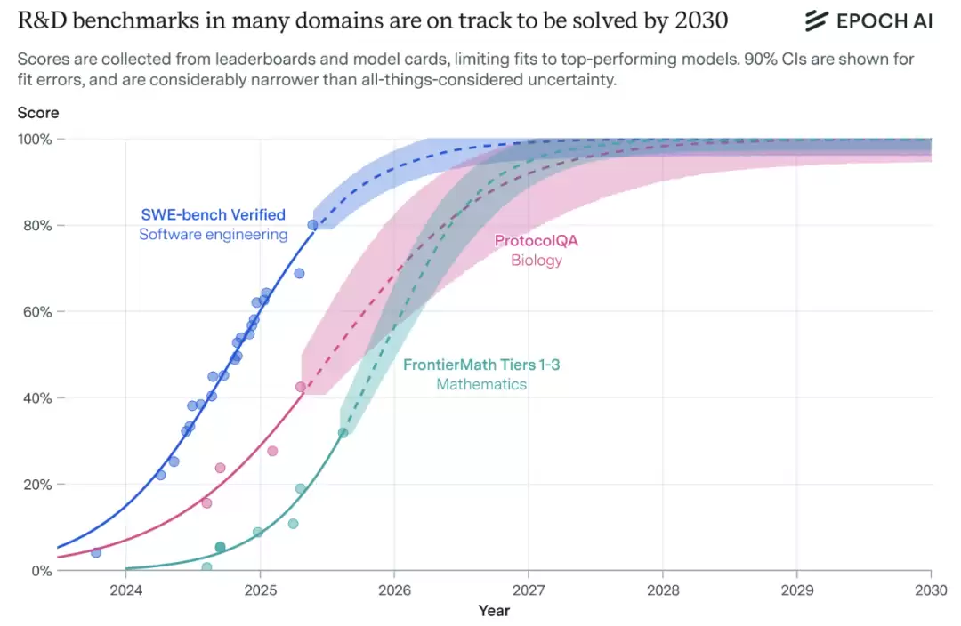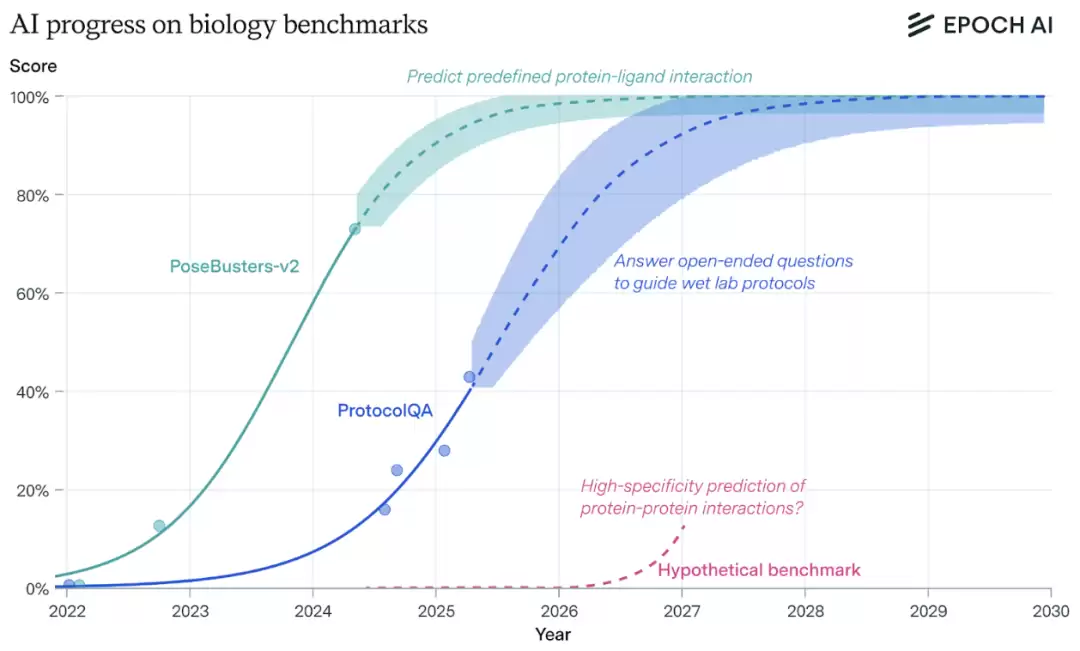 与此同时,生物研发领域的AI桌面研究助理即将登场。现有生物学实验方案问答基准测试预计2030年前全面解决。