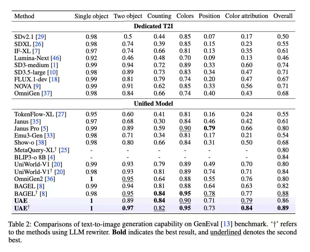 而生成方面,UAE更是获得了同意模型SOTA。GenEval基准上UAE获得0.86综合得分,在统一模型中排名第一,特别是在需要精确理解的计数(0.84)和颜色归因(0.79)任务上表现突出。在更具挑战性的复杂场景处理GenEval++基准(包含三个或更多对象的复杂场景)中,UAE也获得0.475的最佳得分。