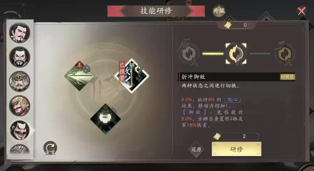 典韦在游戏中最大的特色在于双形态切换机制。他拥有"折冲"与"御敌"两种战斗形态:攻击型的折冲形态可提升3%伤害加成,获得8%吸血效果,同时增加1点移动力;防御型的御敌形态则能提升3%减伤效果,并为周边菱形两格范围内的友军承担伤害。考虑到折冲形态有很多替代武将表现更优,建议主要采用御敌形态作战。当团队需要可靠的前排坦克时,典韦无疑是个绝佳选择。