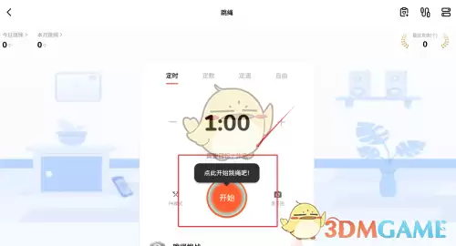 3、在APP中选择"计时跳绳"功能后,你可以自由设置训练时长,或者直接选用预设的时间模式。点击开始后,系统便会自动计时并统计跳绳次数。