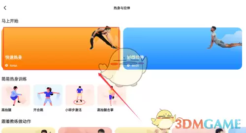 1、启动应用后在首页点击底部"发现"或"训练"板块,直接在搜索栏输入"快速热身"关键词,系统会自动显示相关推荐课程