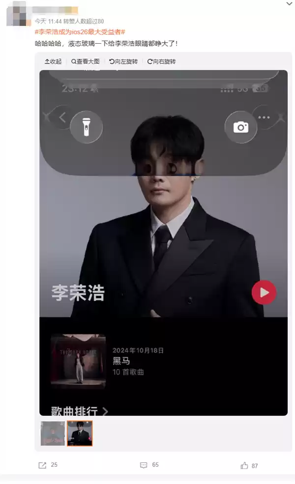 iOS 26新增灵动特效:李荣浩照片滑动实现"小眼变大"功能
