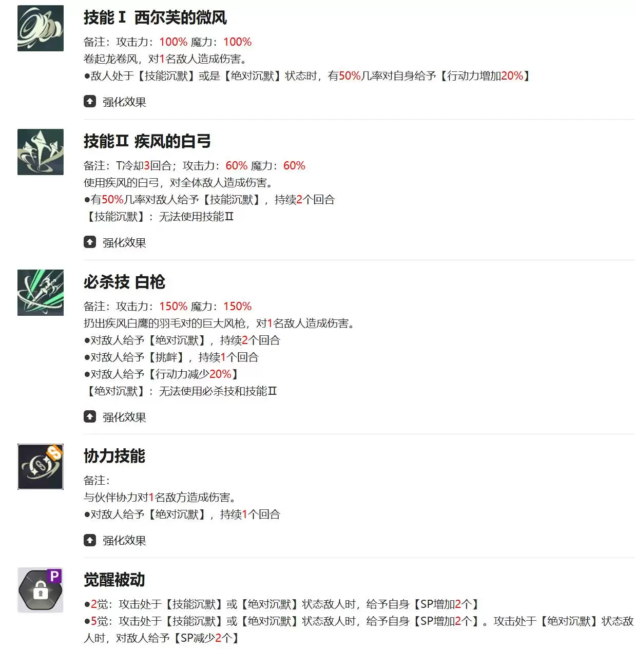 风刃是一个起手技,在击倒或暴击时会触发全体追击,完美适配多段攻击型队友。疾风之白弓不仅仅是有着非常宝贵的群体破甲,而且60%的触发概率在实战中体验下来是相当可靠的了,必杀技白枪则是真正的控场标志性技能,150%的单体伤害配合绝对沉默+挑衅的双重debuff,能精准封锁敌方关键角色的主动技能和必杀。醒被动进一步强化控制,攻击沉默目标时SP回复保证技能的后期combo,5觉后追加的SP削减效果更是让对手直接放不出技能→丢sp→放不出技能的循环,这套技能设计让该角色既能担任副C补伤害,又能作为战术控场大C。