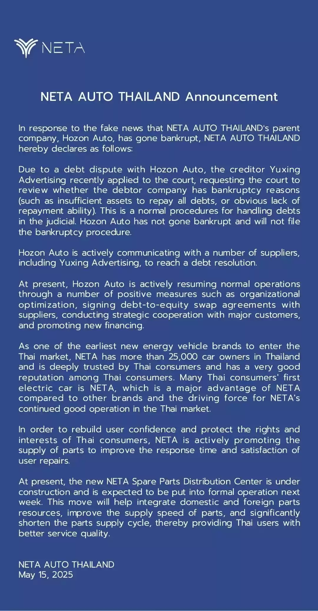 哪吒汽车泰国分公司发布的英文情况说明 来源:哪吒汽车