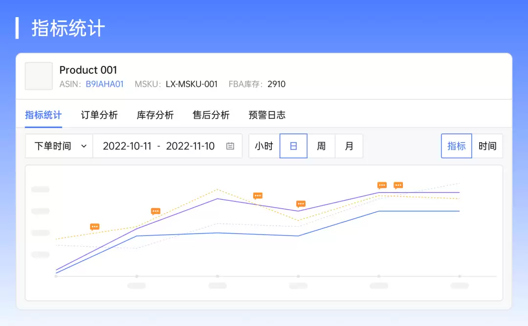 领星ERP自动统计产品的销售、广告、售后、库存等多维的关键数据,以数据和图表呈现;
