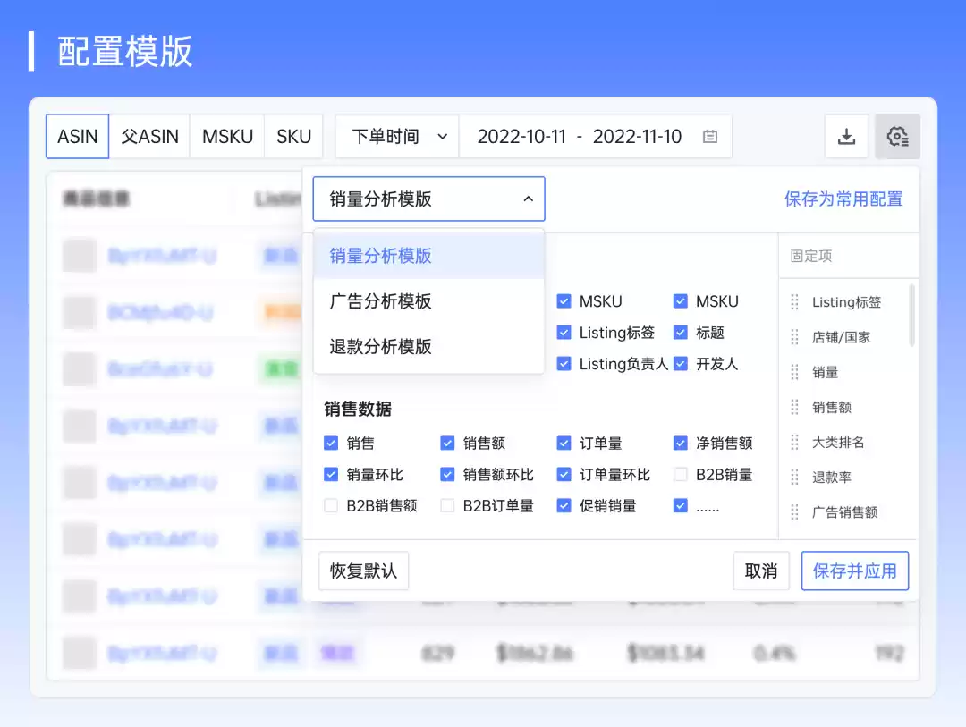 卖家可根据分析需求,在领星ERP配置关键数据保存为模板,比如: