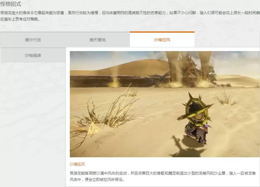 吞渊龙得名于其进食时吞噬一切的姿态,以及巨大的犹如无底深渊一般的胃口。 从外形上来看,吞渊龙颇似一只巨大的海龟,鳍状的四肢有利于在沙海中移动。背部的硬棘不仅可以用来抵御攻击,甚至能够射出,用以攻击远处的目标。 令人意想不到的是,如此巨大的怪物能够在空中漂浮,表面上看,似乎是因为它能够控制热气流,然而实际上其生态远远要比想象的复杂许多。 和其它古龙一样,吞渊龙现身时总是伴随着龙卷和沙尘暴等异常天候。许多升月之地的居民认为吞渊龙是沙漠意志的化身,因而将其当成神明来供奉,并且称呼其为“枯海凶神”。