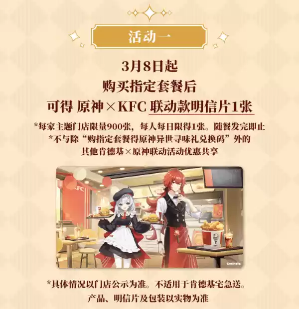 ①3月8日起购买指定套餐后可得原神X KFC联动款明信片1张