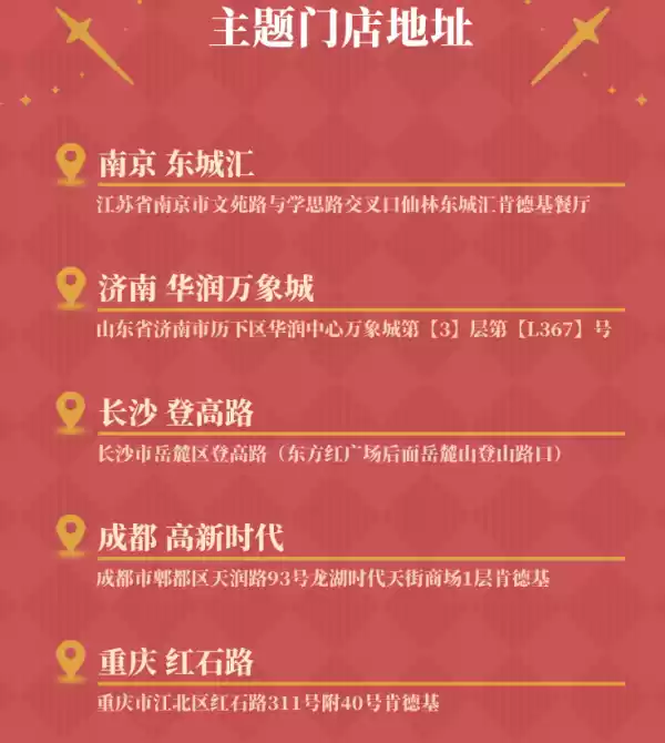 主题门店地址:南京东城汇、济南华润万象城、长沙登高路、成都高新时代、重庆红石路、西安中贸、深圳松岗店、广州五月花、广州仰忠汇、广州珠光路、广州文德路、北京学清路、武汉武大校园、杭州东坡路、合肥宝业广场、上海新宜街。