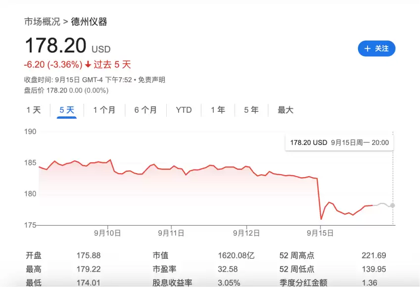 消息一出,美股多家国际模拟芯片巨头同日走弱。9月15日,德州仪器股价下跌 3.1%,安森美半导体股价下跌 2%,恩智浦半导体股价下跌 3.5%,ADI 股价下跌 3%,微芯科技股价也下跌 1.5%。