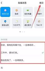 在设置面板切换到"状态"页签,右侧"自动回复"区域可自由编辑回复语。设置妥当后别忘了点击"确定"按钮生效。