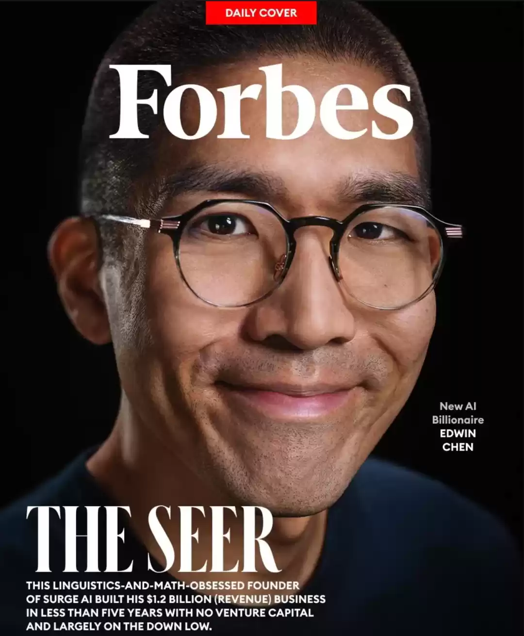 Edwin Chen决定使用「自有资金」支持Surge的决策获得了丰厚回报:他持有的约75%股份估值约180亿美元,这足以使他成为今年福布斯美国400富豪榜上最富有的新晋成员。