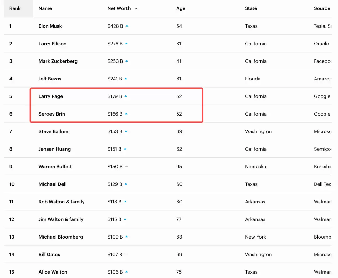 而如果按照净资产的排序,排名前15的最年轻富豪是谷歌的两位创始人,拉里·佩奇和谢尔盖·布林(52岁),以及马斯克(54岁),但没有一个人是40岁以下,年龄最大是巴菲特(95岁)。