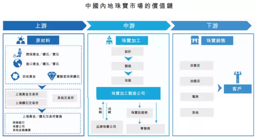 珠宝行业上游涉及原材料采购,涵盖开采和进口黄金、钻石及其他宝石,也包括回收黄金及生产实验室培育的钻石。黄金和钻石通常经上海黄金交易所、上海钻石交易所等平台上在行业参与者之间进行交易。