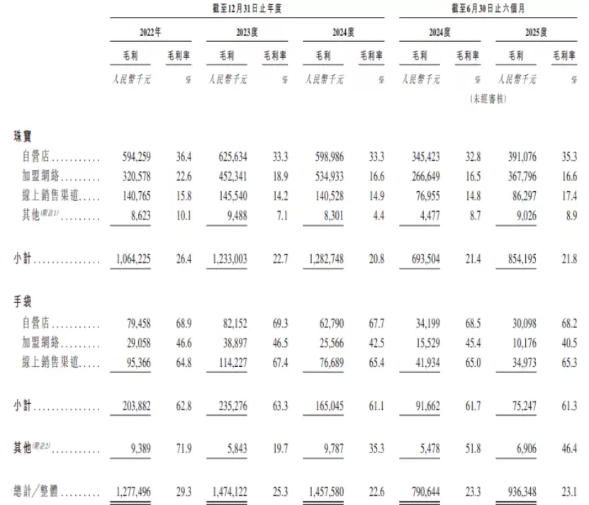 2024年、2024年、2024年及2025年上半年,潮宏基的营业收入分别约43.64亿元、58.36亿元、64.52亿元、40.62亿元,毛利率分别为29.3%、25.3%、22.6%、23.1%,对应的净利润分别约2.05亿元、3.3亿元、1.69亿元、3.33亿元。