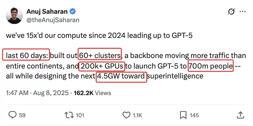上个月刚刚降世的GPT-5背后也是巨量算力投资。OpenAI研究员Anuj Saharan在社交媒体X上说:“自2024年开始研发GPT-5以来,我们的计算能力已增长了15倍。过去60天里,我们构建了60多个集群、传输流量超过整个美国大陆的主干网以及20万多块GPU,以便将GPT-5推向7亿人——同时设计下一个4.5GW超级智能(中心)。”近期,OpenAI还被曝出计划在印度建设至少1GW规模的数据中心,以推动其Stargate(星际之门)项目扩张。