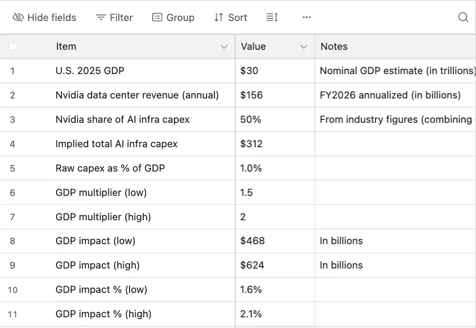他援引分析师数据称,根据英伟达最新的数据中心销售数据,采用标准乘数,到2025年,AI资本支出可能占美国GDP的约2%。这意味着2025年AI对GDP增长的贡献将达到0.7%。