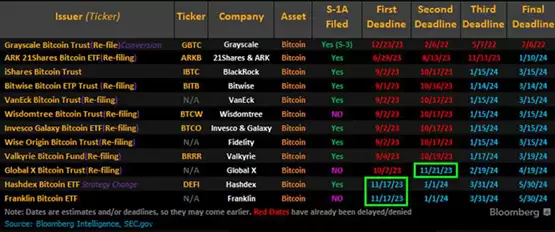 据彭博分析师Seyffart透露,目前已有12家资产管理公司提交了比特币现货ETF的申请。其中,最早的审批截止日期是11月17日,对应的是Hashdex和富兰克林提交的申请。紧随其后的是GlobalX,截止日期为11月21日。