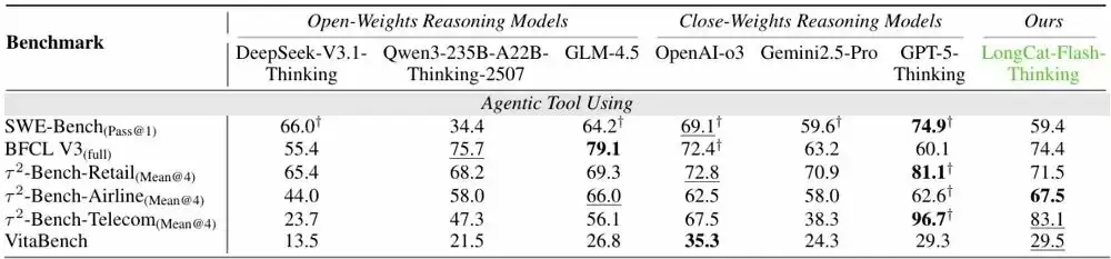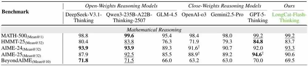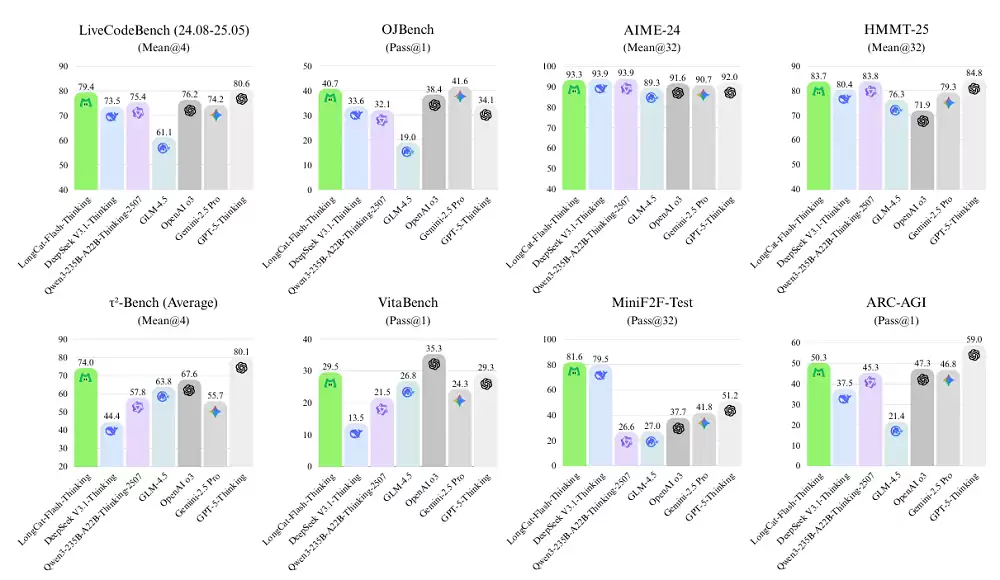 LongCat-Flash-Thinking在多领域基准测试中表现出不俗的实力: