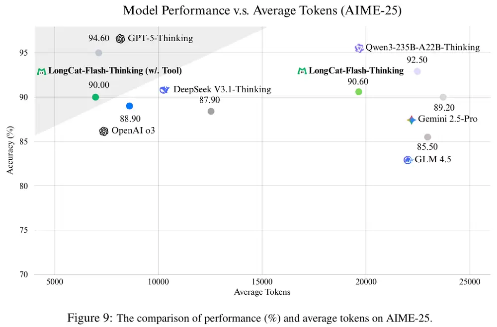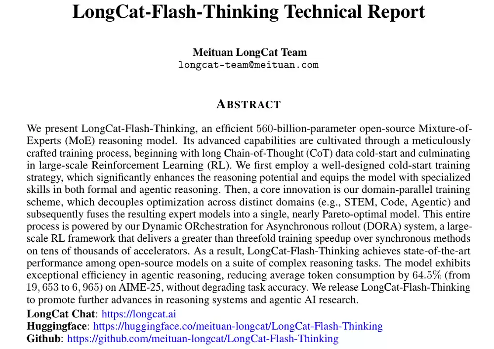 与其基础模型LongCat-Flash类似,效率也是LongCat-Flash-Thinking的最大特点。美团在技术报告中透露,LongCat-Flash-Thinking在自研的DORA强化学习基础设施完成训练,直接将训练速度提升到原来的3倍还多,增幅超过200%。该模型重点优化了形式推理和Agent推理任务,使用工具后推理效率很高,例如,可将AIME-25基准测试中的平均token消耗减少64.5%。