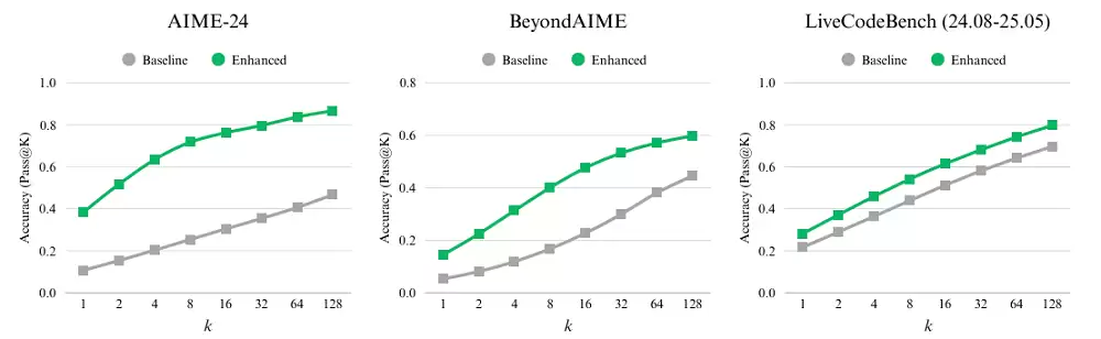 实验表明,这一阶段显著拓宽了模型的“推理边界”:在AIME、BeyondAIME和LiveCodeBench等基准上,单步准确率和高采样准确率均有大幅提升。